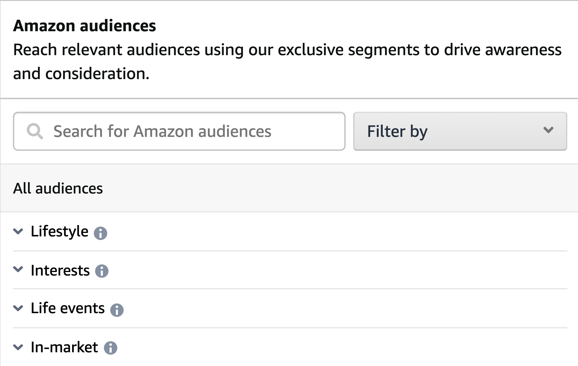 In the beginning, it was only possible to target ASINs with Sponsored Display Ads. Since April 2021, it is now also possible to select specific target groups for targeting. This was previously only possible with the DSP (Demand-side Platform). You can select target groups in four different segments. These include "lifestyle," "interests," "life events," and "in-market factors”.